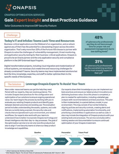 Business-critical applications are the lifeblood of an organization, and an attack against any of them has the potential for a devastating impact across the entire organization. That’s why more than 20% of the Fortune 100 choose to partner with Onapsis to solve the challenges of vulnerability management, threat monitoring, and application security testing for their business-critical applications. Onapsis is proud to be an Oracle partner and the only application security and compliance platform in the SAP Endorsed Apps Program. Digital transformation projects, including cloud migration and modernization of critical systems, are necessary but create time and resourcing challenges for already constrained IT teams. Security teams may have implemented solutions but lack the time, knowledge, expertise, and staff to better optimize them to the specific needs of the business.