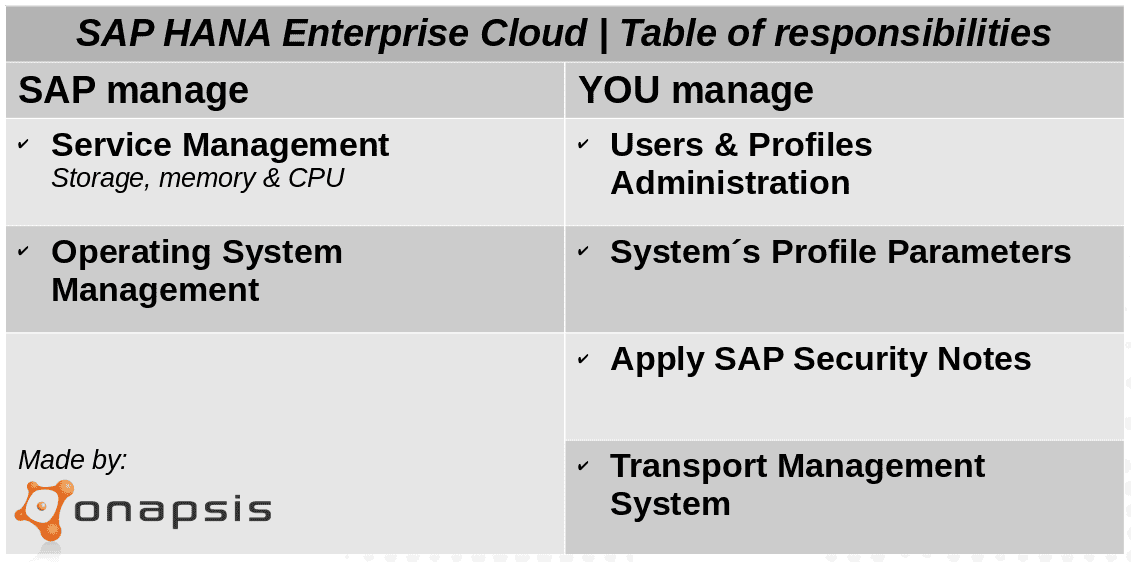Contract negotiation is the right tool to ensure the service levels demanded by the organizations. Regarding OS management, servers will most likely be shipped with the latest available security patch level. Depending on your service contract agreements, installation of OS patches and security updates can be on your schedule. On the other hand, creating and maintaining OS users and groups, as well as configuring OS parameters relies on SAP. In addition, troubleshooting operating system problems and monitoring system logs and file systems also rely on SAP. However, the situation changes when speaking about SAP version upgrades. Organizations must program and develop their upgrade work plans, in concordance with their daily work operations. Modification adjustments, as well as functional changes to custom objects must be done by each company to avoid any misunderstanding.