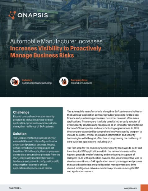 This large automobile manufacturer worked with Onapsis to expand their cybersecurity program to include SAP systems and ensure they were optimized to stay secure and online.