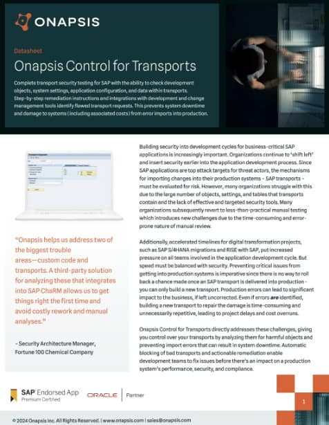 “Onapsis helps us address two of the biggest trouble areas—custom code and transports. A third-party solution for analyzing these that integrates into SAP ChaRM allows us to get things right the first time and avoid costly rework and manual analyses.”