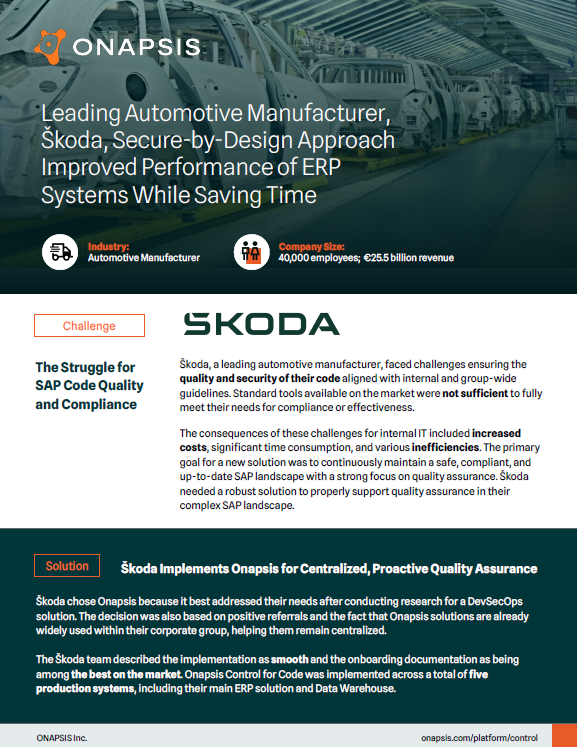 Since implementing Onapsis, Škoda has seen continuous improvements in quality assurance. Onapsis Control for Code has helped them maintain more compliant and secure system landscapes, contributing to overall stability and risk reduction.