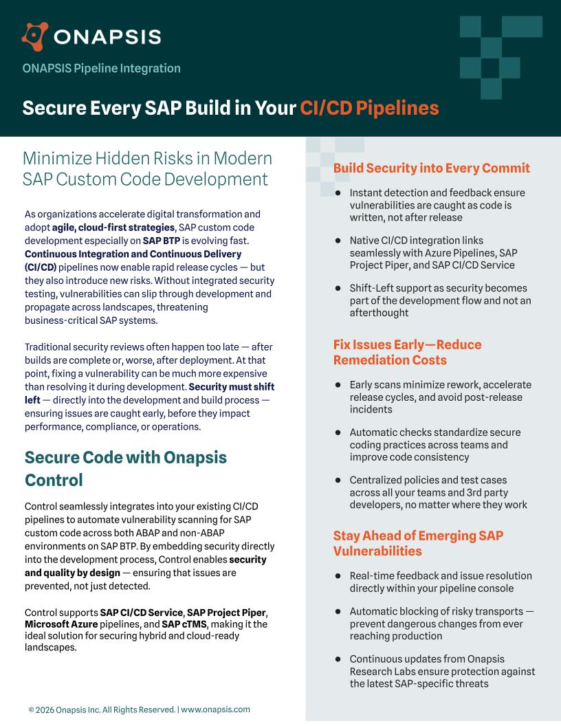 Control supports SAP CI/CD Service, SAP Project Piper, Microsoft Azure pipelines, and SAP cTMS, making it the ideal solution for securing hybrid and cloud-ready landscapes.