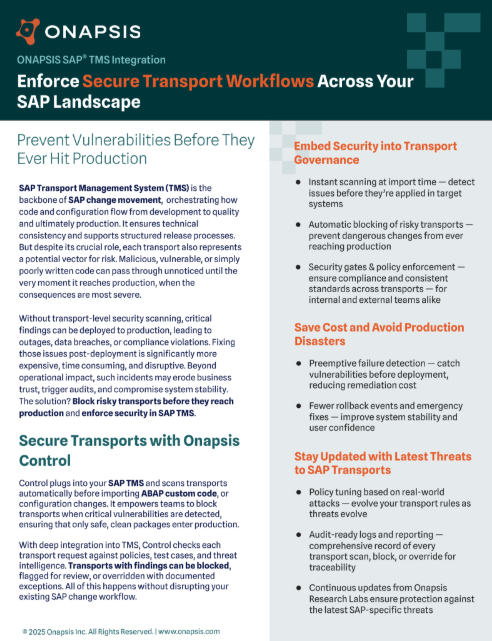 Secure Transports with Onapsis Control: Onapsis Control integrates into SAP TMS to automatically scan transports before importing ABAP custom code or configuration changes.