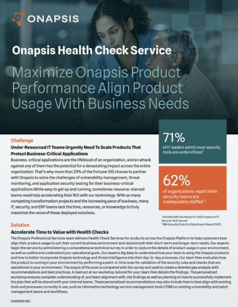 Business-critical applications are the lifeblood of an organization, and an attack against any of them has the potential for a devastating impact across the entire organization. That’s why more than 20% of the Fortune 100 choose to partner with Onapsis to solve the challenges of vulnerability management, threat monitoring, and application security testing for their business-critical applications.While easy to get up and running, sometimes resource-starved teams need help accelerating their ROI with our technology. With so many competing transformation projects and the increasing pace of business, many IT, security, and ERP teams lack the time, resources, or knowledge to truly maximize the value of these deployed solutions.