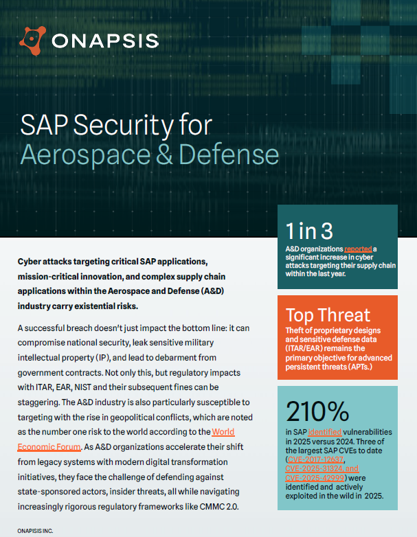 Cyber attacks targeting critical SAP applications, mission-critical innovation, and complex supply chain applications within the Aerospace and Defense (A&D) industry carry existential risks. A successful breach doesn’t just impact the bottom line: it can compromise national security, leak sensitive military intellectual property (IP), and lead to debarment from government contracts. Not only this, but regulatory impacts with ITAR, EAR, NIST and their subsequent fines can be staggering. The A&D industry is also particularly susceptible to targeting with the rise in geopolitical conflicts, which are noted as the number one risk to the world according to the World Economic Forum. As A&D organizations accelerate their shift from legacy systems with modern digital transformation initiatives, they face the challenge of defending against state-sponsored actors, insider threats, all while navigating increasingly rigorous regulatory frameworks like CMMC 2.0.