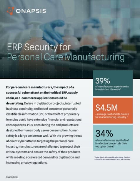 Cyber attacks targeting the personal care industry are on the rise. Successful attacks on ERP systems can be particularly devastating, with the potential to disrupt supply chains, interfere with product safety and delivery, interrupt e-commerce, and result in loss of consumer PII or company IP (e.g., product formulas.)